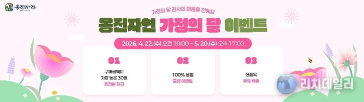 리치데일리 김상현 기자 | 옹진군은 5월 가정의 달을 맞아 지역 특산물 온라인 판로 확대와 옹진자연몰 이용 활성화를 위해 ‘2026년 옹진자연 가정의 달 맞이 이벤트’를 오는 4월 22일부터 5월 20일까지 총 29일간 운영한다고 밝혔다.