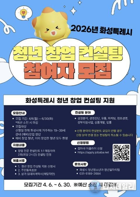 리치데일리 김상현 기자 | 화성특례시는 오는 6월 30일까지 ‘2026년 청년 창업 컨설팅 지원사업’ 참여자를 모집한다.