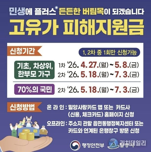 리치데일리 김상현 기자 | 경남 밀양시는 고유가로 인한 시민 부담 완화를 위해 4월 27일부터 7월 3일까지 ‘고유가 피해지원금’ 신청을 접수한다.