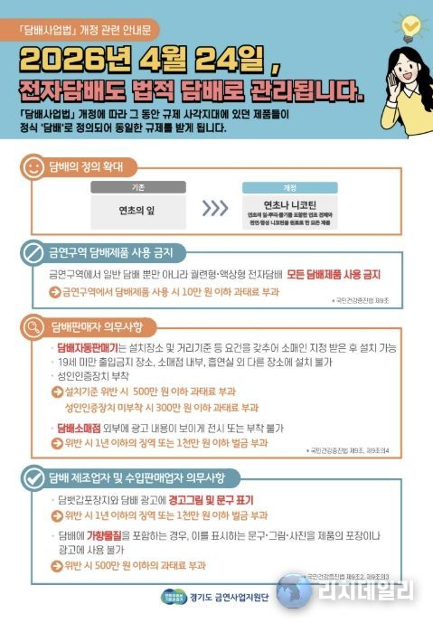 이번 점검은 2026년 4월 24일부터 시행되는 '담배사업법' 개정에 따른 조치로, 액상형 전자담배 등 신종 담배 제품이 처음으로 본격적인 법적 관리 대상에 포함되면서 점검 범위가 크게 확대됐다.