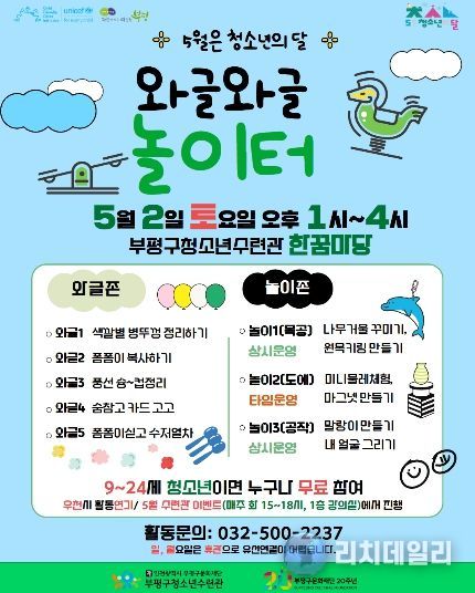 리치데일리 김상현 기자 | 부평구청소년수련관은 오는 5월 2일 청소년 체험 행사 ‘와글와글 놀이터’를 운영한다고 밝혔다.