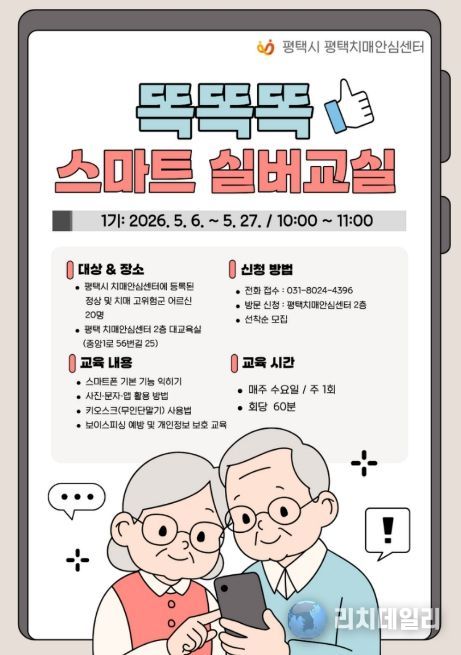리치데일리 김상현 기자 | 평택치매안심센터는 오는 5월 6일부터 27일까지 치매 예방 및 인지 기능 강화를 위한 ‘똑똑똑 스마트 실버교실’을 운영한다고 밝혔다.