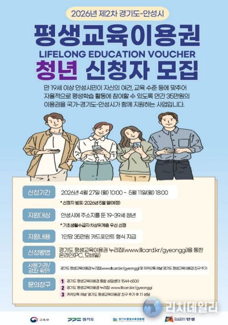 리치데일리 김상현 기자 | 안성시는 시민의 평생학습 참여 기회를 두텁게 보장하기 위해 오는 4월 27일 오전 10시부터 5월 11일 오후 6시까지 ‘2026년 제2차 경기도-안성시 평생교육이용권’ 지원 대상자를 모집한다고 밝혔다.