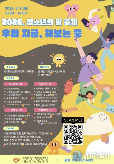 리치데일리 김상현 기자 | 수원시청소년청년재단 권선청소년청년센터가 오는 5월 9일, 청소년이 주인공이 되어 직접 경험하고 도전하는 참여형 축제 ‘지금우리, 해보는중’을 개최한다고 밝혔다.