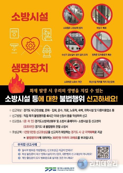 신고는 불법행위 목격 후 48시간 이내 온라인(경기도소방재난본부 및 소방서 홈페이지) 또는 관할 소방서 방문을 통해 가능하다. 인정 시 건당 5만 원의 포상금이 지급되며, 위반자에게는 최대 300만 원 이하의 과태료가 부과된다. 단, 경미한 사례 등 일부는 포상 대상에서 제외된다.