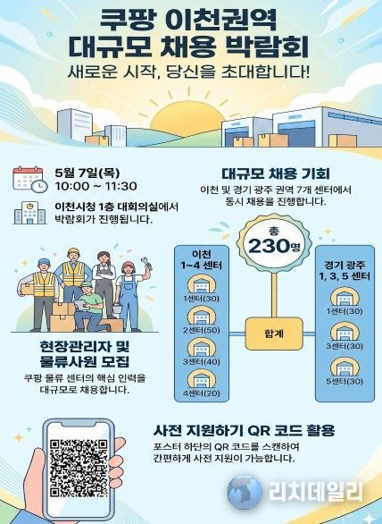 리치데일리 김상현 기자 | 이천시는 오는 5월 7일 오전 10시부터 11시 30분까지 이천시청 1층 대회의실에서 ‘쿠팡 이천권역 대규모 채용 박람회’를 개최한다.