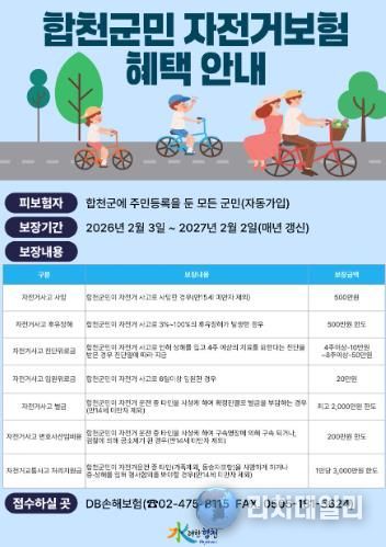 장재혁 합천군수 권한대행은 “자전거 이용 증가에 따라 사고 위험도 함께 높아지고 있는 만큼, 군민 자전거보험을 통해 사고 발생 시 경제적 부담을 덜고 보다 안전하게 자전거를 이용할 수 있도록 지원하고 있다”며 “앞으로도 자전거도로 정비와 안전시설 확충 등 다양한 정책을 통해 안전한 자전거 환경 조성에 힘쓰겠다”고 밝혔다.