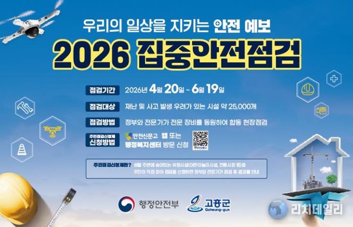 리치데일리 김상현 기자 | 고흥군은 재난과 안전사고 예방을 위해 4월 20일부터 6월 19일까지 2개월간 ‘2026년 집중안전점검’을 실시한다고 밝혔다.