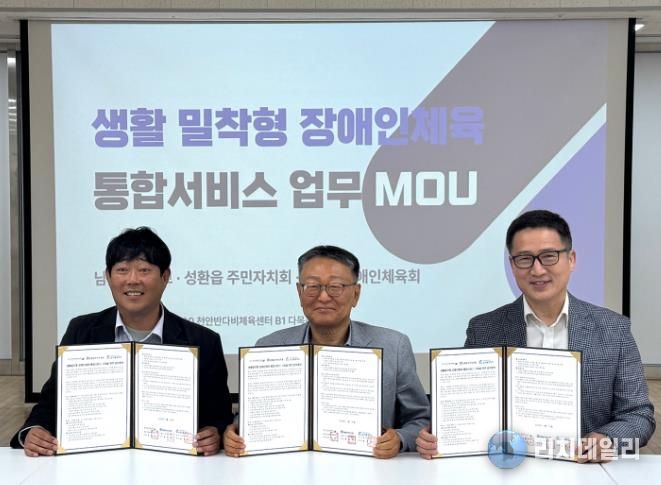 리치데일리 김상현 기자 | 천안시장애인체육회는 22일 천안반다비체육센터에서 성환읍 주민자치회, 남서울대학교와 ‘생활밀착형 장애인체육 통합서비스 구축을 위한 업무협약’을 체결했다.