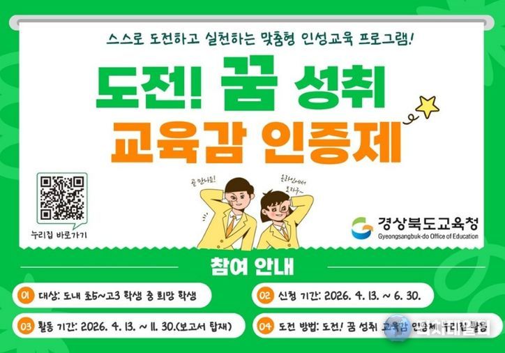 올해로 4회째를 맞이하는‘도전! 꿈 성취 교육감 인증제’는 경북형 성장 중심 인성 특화 프로그램이다. 인문.봉사.체육.예술.외국어.통합 등 다양한 분야의 인증 프로그램을 통해 학생들이 스스로 목표를 설정하고 도전에 참여하고 있으며, 그 결과 지금까지 초·중·고 학생 463명이 금장, 은장, 동장 인증을 받았다.
