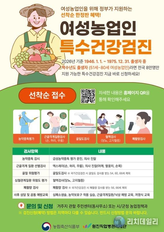 지원 대상은 기장군에 거주하며 농업경영체로 등록된 짝수년도 출생의 51세부터 80세까지 여성농업인으로, 선착순 161명을 모집한다. 검진 항목은 근골격계, 심혈관계, 골절·손상 위험도, 폐활량, 농약 중독 검사 등으로 구성되며, 전문의 상담과 예방 교육도 함께 제공된다.