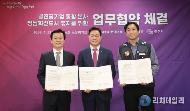 경남도는 22일 진주시, 한국남동발전노동조합과 함께 ‘발전공기업 통합 본사 경남혁신도시 유치’를 위한 업무협약(MOU)을 체결했다. 이번 협약은 발전사 통합이라는 국가 정책 기조에 맞춰, 지자체와 노동계가 실효성 있는 유치 활동과 미래 에너지 전략을 공동으로 실천하기 위해 추진됐다.