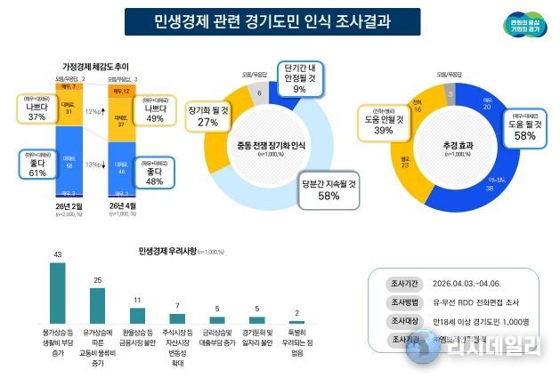 정두석 경기도 기획조정실장은 “가정 경제 형편이 두 달 만에 급격히 나빠졌다는 조사 결과는 현재 민생 현장의 어려움을 보여준다”며 “추경 예산이 빠르게 집행될 수 있도록 도의회와 긴밀히 협의하여 고유가와 고물가로 고통받는 도민들의 부담을 덜어드리도록 하겠다”고 밝혔다.