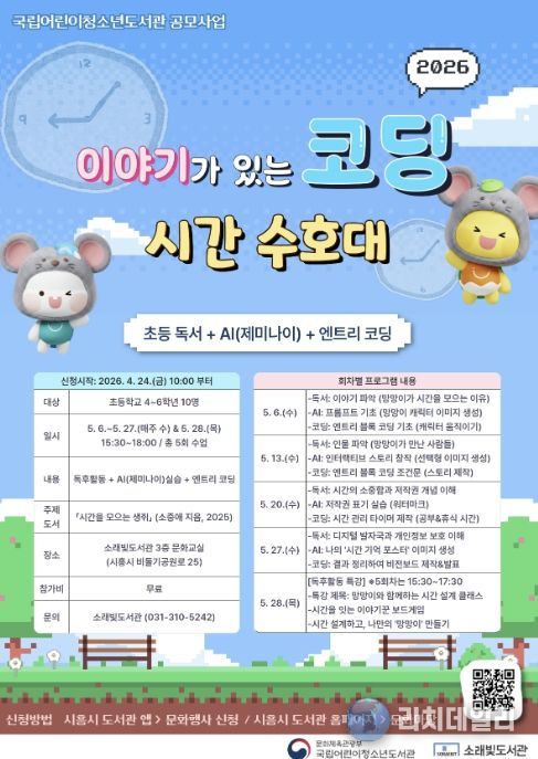 리치데일리 김상현 기자 | 시흥시 소래빛도서관은 국립어린이청소년도서관이 주최하는 ‘2026년 이야기가 있는 코딩’ 공모사업 운영기관으로 선정돼 오는 5월 6일부터 어린이 대상 독서·디지털 융합 프로그램을 운영한다.