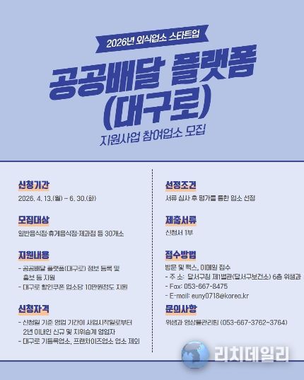 리치데일리 김상현 기자 | 대구 달서구는 신규 외식업소의 조기 정착과 경영 안정화를 돕기 위해 ‘2026년 외식업소 스타트업 공공배달 플랫폼 지원사업’을 추진한다.