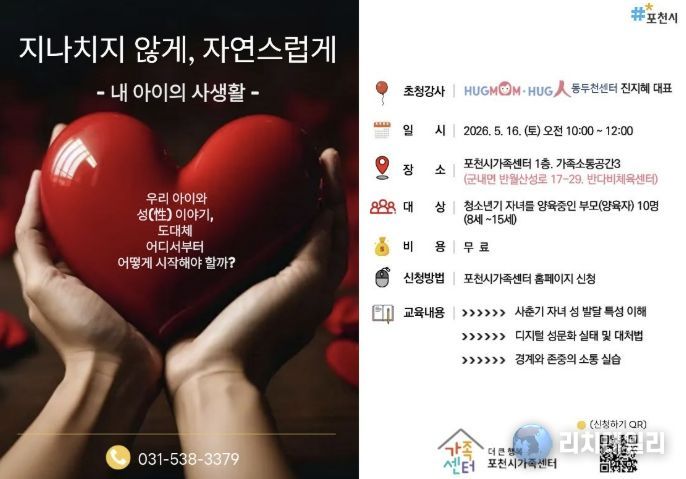 리치데일리 김상현 기자 | 포천시 직영 더 큰 행복 포천시가족센터는 오는 21일부터 사춘기 자녀를 둔 양육자를 대상으로 부모 교육 프로그램 ‘지나치지 않게, 자연스럽게’의 참여자를 모집한다. 이번 교육은 5월 16일 오전, 포천시가족센터 가족소통공간(반다비체육센터 1층)에서 대면 강의로 진행된다.