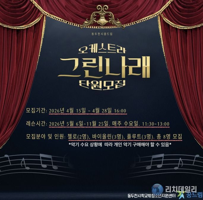 리치데일리 김상현 기자 | 동두천시학교밖청소년지원센터는 2026년을 맞아 학교 밖 청소년을 대상으로 ‘그린나래 오케스트라’ 신규 단원을 모집한다고 밝혔다.