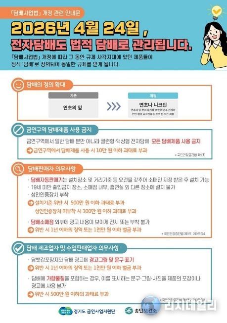 리치데일리 김상현 기자 | 평택시는 2026년 4월 24일부터 시행되는 개정 '담배사업법'에 따라 전자담배를 포함한 모든 니코틴 제품이 ‘담배’로 규정되며, 금연구역 내 전자담배 흡연 시 과태료 10만 원이 부과된다고 밝혔다.