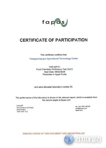 리치데일리 김상현 기자 | 양평군은 영국 식품환경연구청(FERA)이 주관한 ‘2026년 잔류농약 국제비교숙련도 평가’에서 최고 수준의 분석능력을 인정받아 3년 연속 우수성을 입증했다고 21일 밝혔다.