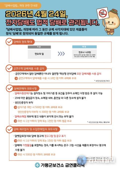 리치데일리 김상현 기자 | 가평군보건소는 '담배사업법' 개정에 따라 이달 24일부터 담배 규제가 대폭 강화된다고 밝혔다.