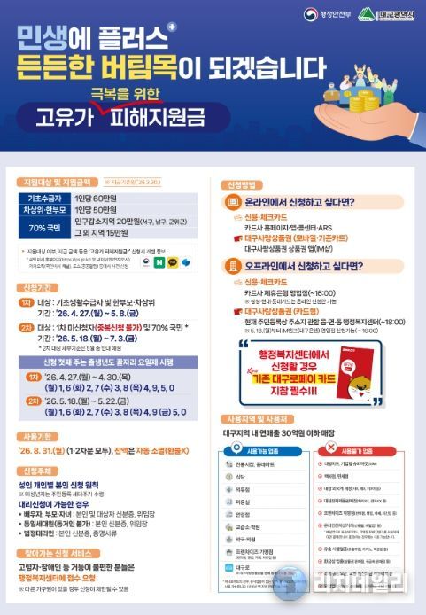 지원금은 유흥·사행업종을 제외한 대구광역시 내 연매출 30억원 이하 소상공인 매장에서 사용 가능하며, 사용기한은 8월 31일까지로 기한 내 미사용 금액은 자동 소멸된다.