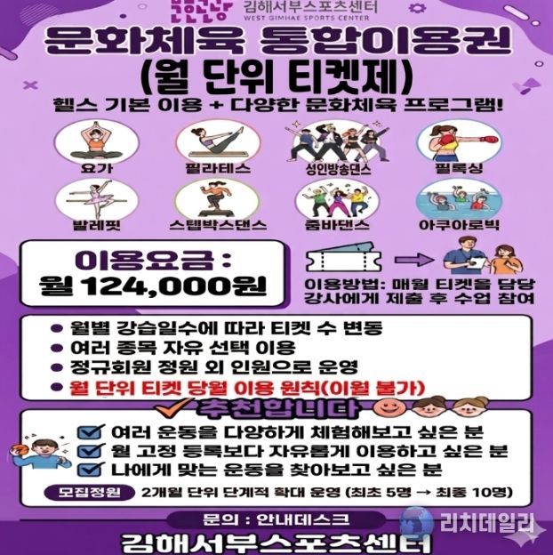 리치데일리 김상현 기자 | (재)김해문화관광재단 김해서부스포츠센터는 이용자 중심의 유연한 운동환경 조성과 문화체육 프로그램 활성화를 위해 김해시 공공체육시설 최초로 ‘문화체육 티켓제 통합이용권’ 도입을 추진한다고 밝혔다.
