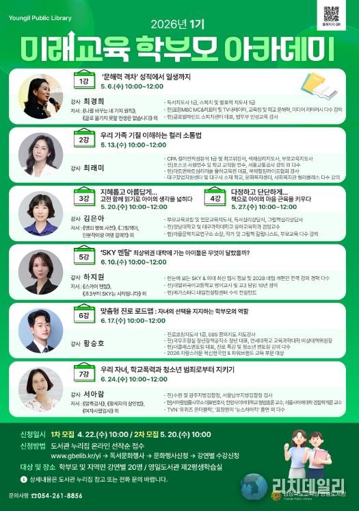 리치데일리 김상현 기자 | 경상북도교육청 영일도서관은 오는 5월 6일부터 학부모 및 지역주민을 대상으로 ‘2026 1기 미래교육 학부모 아카데미’를 운영하고 수강생을 모집한다.