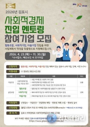 리치데일리 김상현 기자 | 김포시는 협동조합, 사회적기업, 마을기업 등 사회적경제기업 진입을 지원하기 위해 ‘2026년 김포시 사회적경제 진입 멘토링’ 참여기업을 오는 11월 30일까지 수시 모집한다.