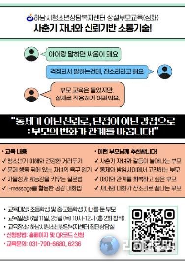 리치데일리 김상현 기자 | 하남시 청소년상담 복지센터가 부모와 자녀 간 소통을 돕기 위한 부모교육 프로그램을 한층 강화한다. 특히 청소년기 자녀와의 대화에 어려움을 느끼는 부모들이 실제로 체감할 수 있는 교육으로 개편한 것이 특징이다.