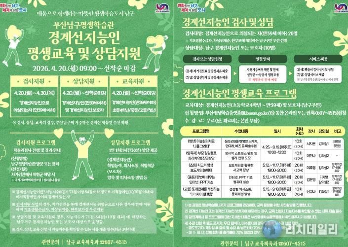 리치데일리 김상현 기자 | 부산 남구는 경계선지능인의 일상생활 기능 향상과 사회 적응을 지원하기 위해 '경계선지능인 평생교육 및 상담 지원사업'을 운영한다고 밝혔다.