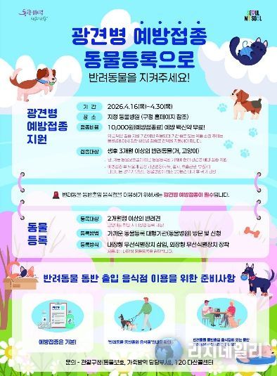 리치데일리 김상현 기자 | 광진구는 반려동물의 건강 증진과 구민의 안전을 위해 ‘2026년 봄철 광견병 예방접종’ 지원을 4월 30일까지 시행한다.