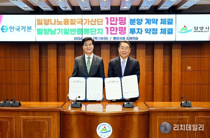리치데일리 김상현 기자 | 경남 밀양시는 23일 시청 소회의실에서 ㈜한국카본, 한국토지주택공사 경남지역본부와 함께 ‘밀양나노융합국가산업단지 부지분양 계약 및 밀양남기일반물류단지 투자약정’을 체결했다.