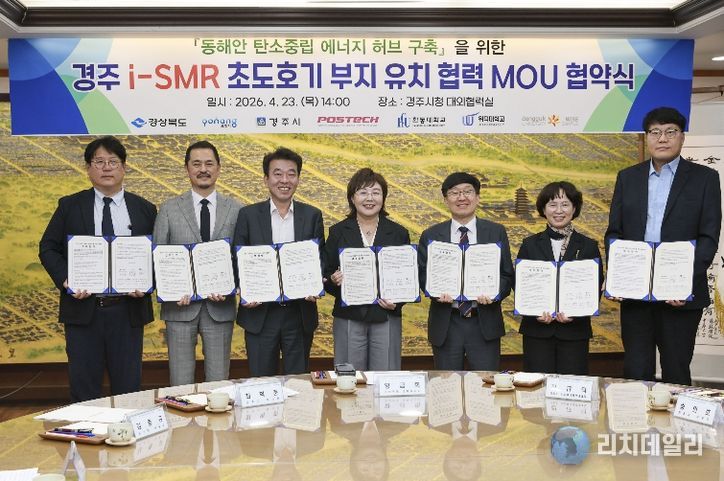 리치데일리 김상현 기자 | 경상북도는 4월 23일 경주시청 대외협력실에서 포항시, 경주시 및 지역 4개 대학(POSTECH, 한동대, 동국대 WISE 캠퍼스, 위덕대)과 업무협약을 맺고,‘경주 i-SMR 초도호기 부지유치’를 위해 7개 기관이 ‘원팀’으로 협력하기로 뜻을 모았다.