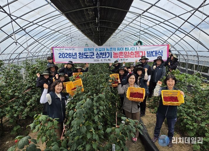 리치데일리 김상현 기자 | 청도군은 농촌인구 감소와 고령화로 일손 부족을 겪고 있는 농가를 지원하기 위해 4월 23일 운문면 방지리 산딸기 농장에서 발대식을 개최하고, 농가의 산딸기 전정 및 수확 작업을 도우며 2026년 상반기 농촌일손돕기의 힘찬 시작을 알렸다.