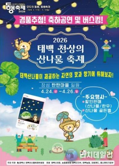 리치데일리 김상현 기자 | 태백시는 오는 24일 오후 6시부터 장성탄탄마당(장성중앙시장 일원) 중앙무대에서‘2026 태백 천상의 산나물 축제’ 개막행사를 진행한다고 밝혔다.