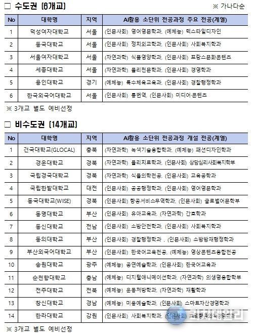 선정 대학은 인공지능(AI)의 윤리적 활용과 비판적 사고 등 인공지능(AI) 전반에 대한 ‘기초 교양 교과’와, 인공지능(AI)을 비공학계열 전공에 활용하는 ‘인공지능(AI) 활용 소단위 전공 과정’을 개발·운영하게 된다. 또한, 학습자에게 양질의 인공지능(AI) 교육을 제공할 수 있도록 교수자 역량 강화와 관리 체계 구축도 병행 추진한다. 개발된 교육과정을 타 대학과 공유하고, 대학 현장 전반에 인공지능(AI) 교육의 확산을 도모한다.