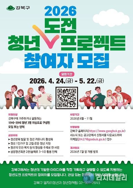 리치데일리 김상현 기자 | 서울 강북구는 청년들의 창의적인 아이디어를 지역사회에서 실현할 수 있도록 돕는 ‘2026년 청년도전 프로젝트’ 참여자를 모집한다고 밝혔다.