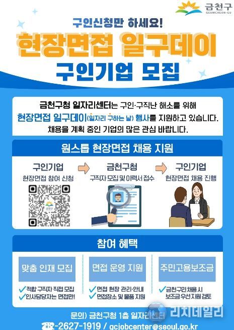 리치데일리 김상현 기자 | 금천구는 구인·구직난을 해소하고, 기업의 원활한 채용을 지원하기 위해 ‘현장면접 일구데이’ 참여 기업을 상시 모집한다고 밝혔다.