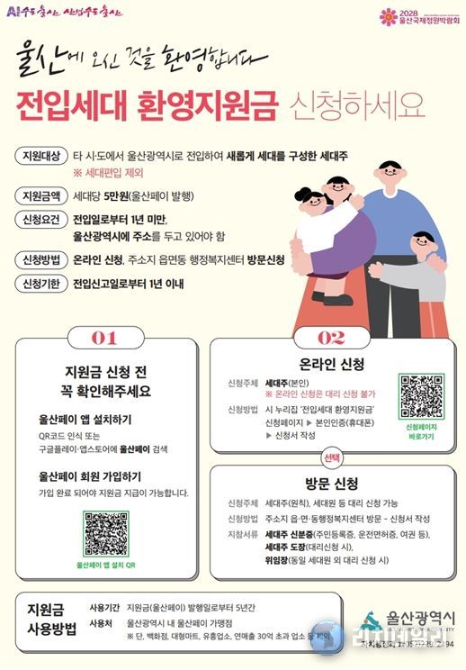 전입세대 환영 지원금은 울산에 새롭게 세대를 구성한 전입세대를 환영하고 울산에 조기 정착을 지원하기 위해 세대당 5만 원을 울산페이로 지원하는 사업이다.