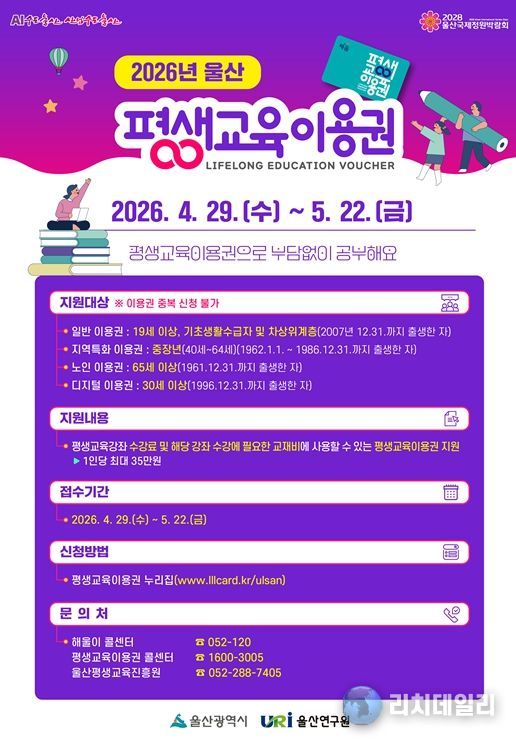 리치데일리 김상현 기자 | 울산시가 경제적 여건에 따른 교육격차를 완화하고, 성인의 자아실현을 지원하기 위해 ‘2026년 평생교육이용권 지원사업’의 2차 신청 접수에 나선다.