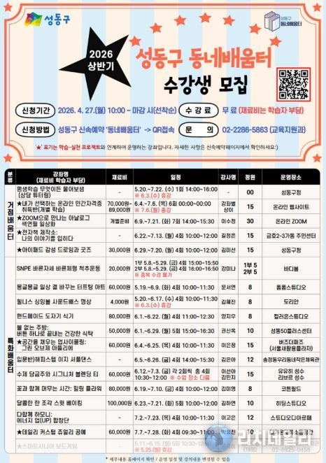 리치데일리 김상현 기자 | 서울 성동구가 올해 약 3,800만 원의 예산을 투입해 주민 주도형 평생학습 생태계를 조성하는 ‘2026년 성동구 동네배움터’ 운영에 본격적으로 나선다고 밝혔다.