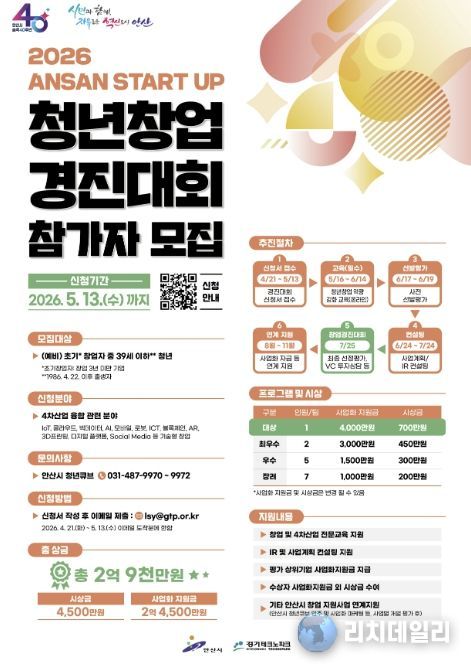 리치데일리 김상현 기자 | 안산시는 창의적인 아이디어를 보유한 청년 창업가를 발굴하기 위해 내달 13일까지 ‘2026 안산 스타트업 청년창업 경진대회’ 참가자를 모집한다고 24일 밝혔다.