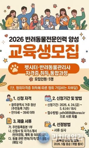 리치데일리 김상현 기자 | 광주광역시는 반려동물 산업 성장에 대응하고 전문역량을 갖춘 인재 양성을 위한 ‘2026년 반려동물 전문인력 양성교육’을 실시한다.