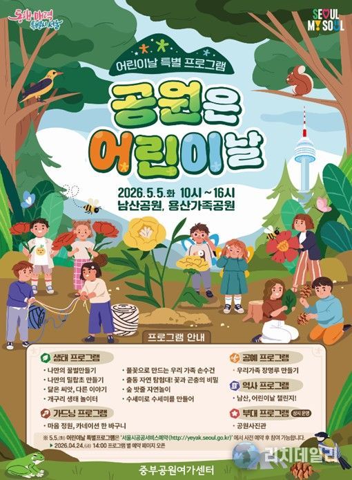 리치데일리 김상현 기자 | 서울시 중부공원여가센터는 5월 5일 어린이날을 맞아 ‘남산하늘숲길’ 개방 이후 산책 명소로 많은 사랑을 받고 있는 남산공원과, 푸르른 잔디가 펼쳐진 용산가족공원에서 온 가족이 함께 즐길 수 있는 특별프로그램 '공원은 어린이날'을 운영한다고 밝혔다.