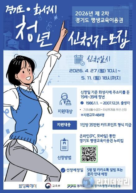 리치데일리 김상현 기자 | 화성특례시는 청년층의 자기계발과 역량 강화를 지원하기 위해 ‘2026년 평생교육이용권 지원사업’ 지역특화(청년) 분야 2차 이용자를 모집한다고 밝혔다.