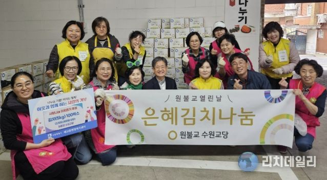 리치데일리 김상현 기자 | 수원시 팔달구 매교동은 지난 22일, 원불교 수원교당(교구장 김도천)으로부터 직접 담근 배추김치(5kg) 100박스를 기부받았다고 밝혔다.