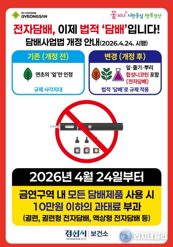 리치데일리 김상현 기자 | 경산시는 4월 24일부터 5월 15일까지 3주간 경산시보건소, 일자리경제과, (사)한국외식업중앙회 경산시지부와 함께 담배사업법 개정에 따른 법령 준수 정착을 위해 금연 구역 내 흡연 행위에 대한 집중 지도와 점검을 실시한다.