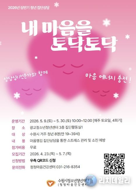 리치데일리 김상현 기자 | 수원시청소년청년재단 청청마음건강센터는 학업과 취업준비, 직장생활 등 경쟁 중심 환경으로 인해 심리적 소진을 겪는 관내 청년들을 대상으로, 오는 5월 7일까지 전문가가 참여하는 집단상담 프로그램 ‘내 마음을 토닥토닥’ 참가자를 모집한다고 밝혔다.