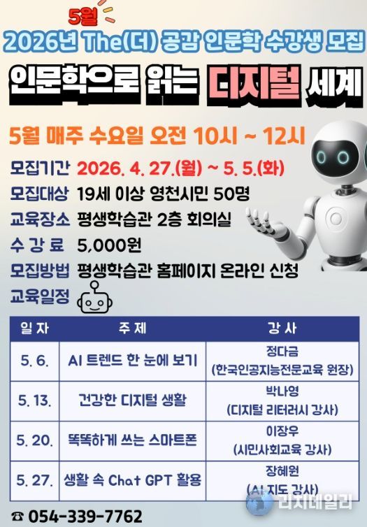 리치데일리 김상현 기자 | 영천시 평생학습관은 시민의 인문학적 소양 함양을 위해 운영하는 ‘The(더) 공감 인문학 특강’ 5월 수강생을 27일부터 5월 5일까지 모집한다고 밝혔다.