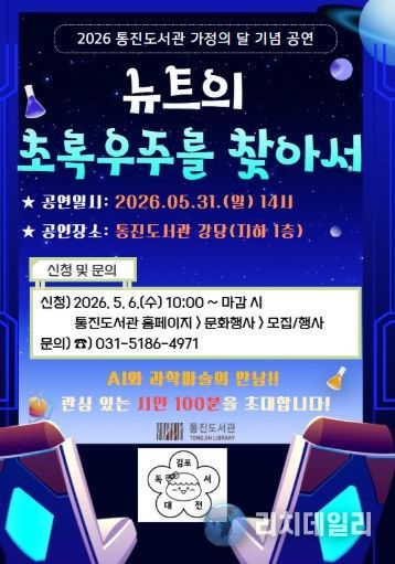 리치데일리 김상현 기자 | 김포시 통진도서관이 가정의 달을 맞아 온 가족이 함께 즐길 수 있는 공연 '뉴트의 초록우주를 찾아서'를 오는 5월 31일 오후 2시 통진도서관 강당에서 개최한다.